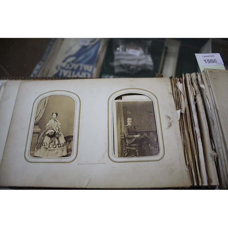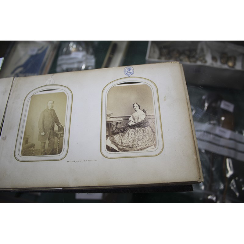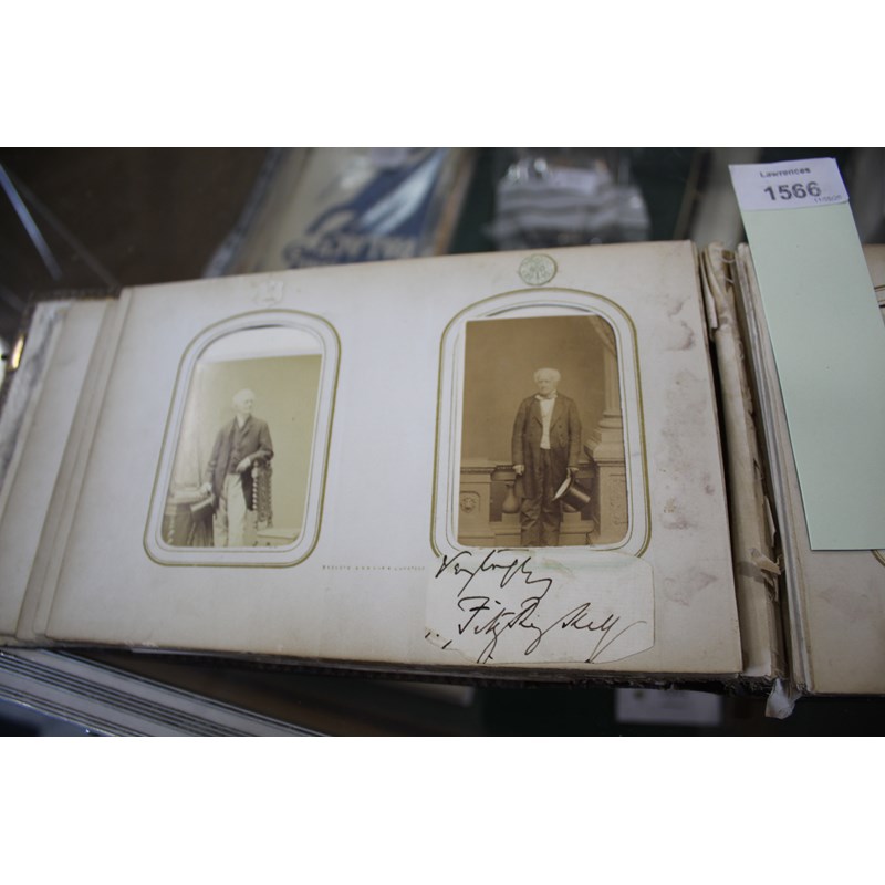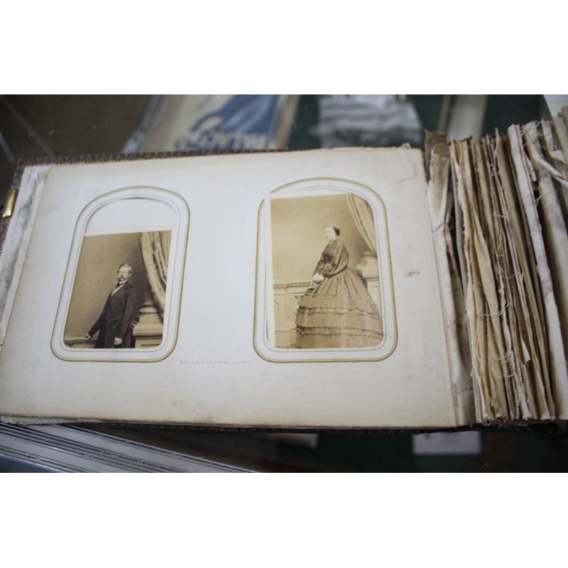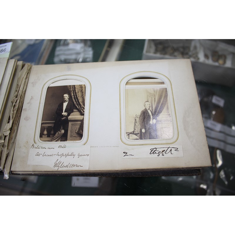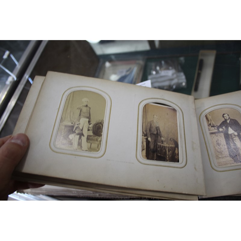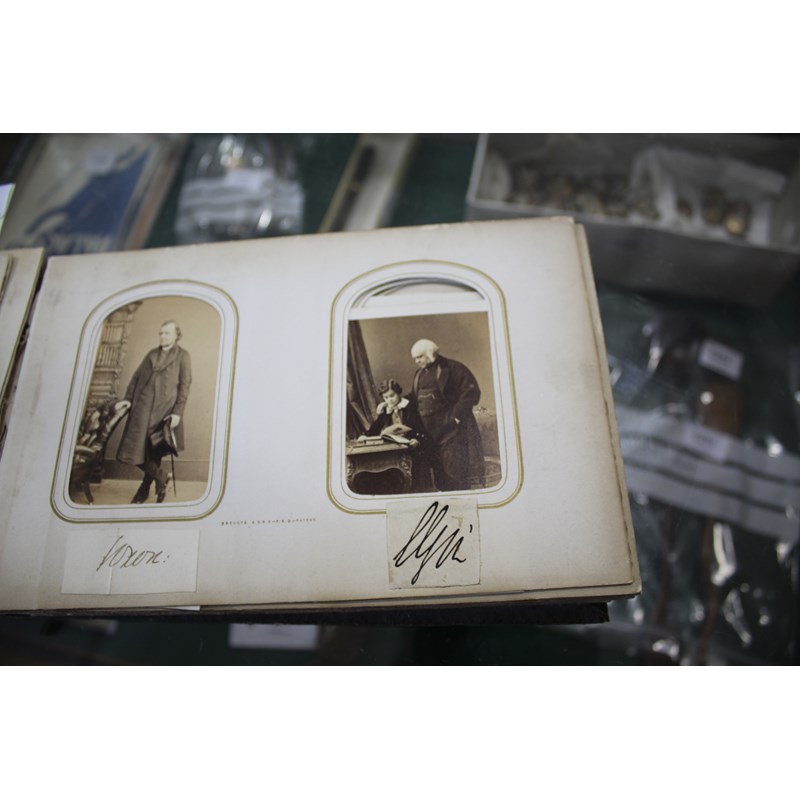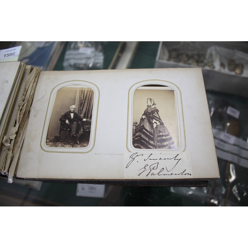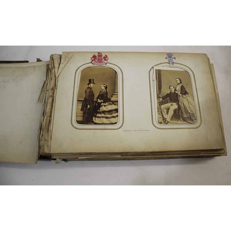 an album dated 1861, with various studio photographs including Queen Victoria & Prince Consort (Mayall), Prince of Wales, Princess Louisa, Prince Louis of Hesse, Princess Helena, Viscountess Palmerston (signed underneath), and a large number of other photographs of figures from Victorian high society (some with signatures underneath). Album falling apart.