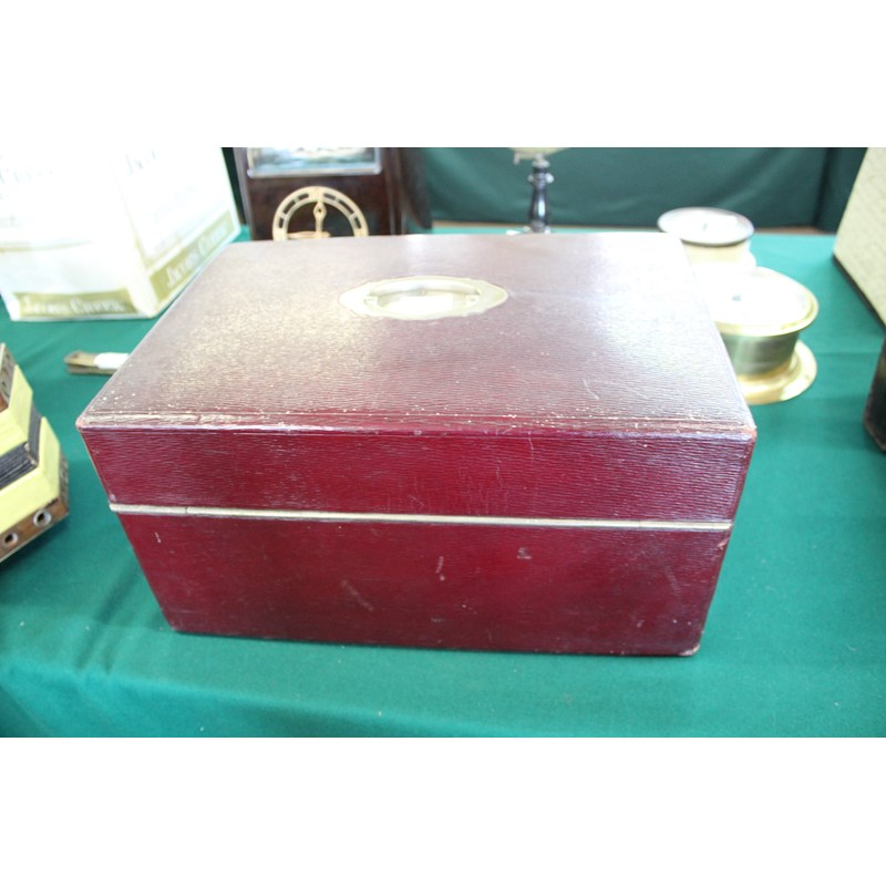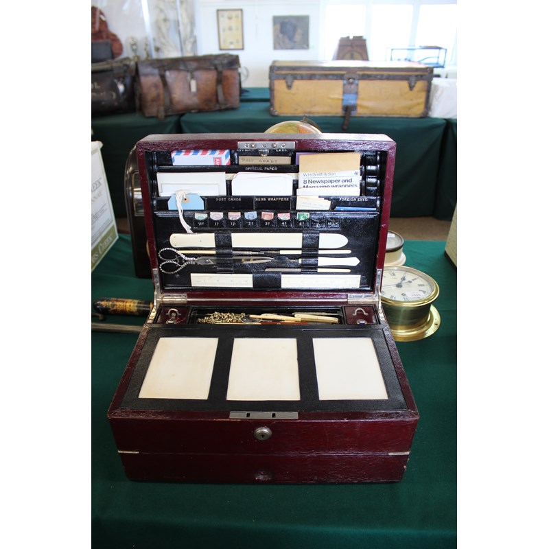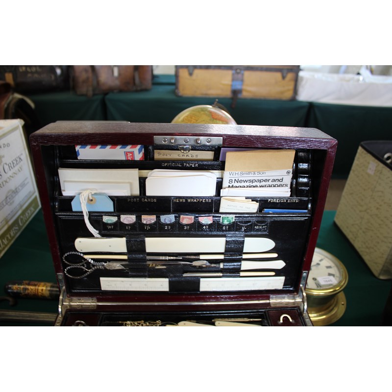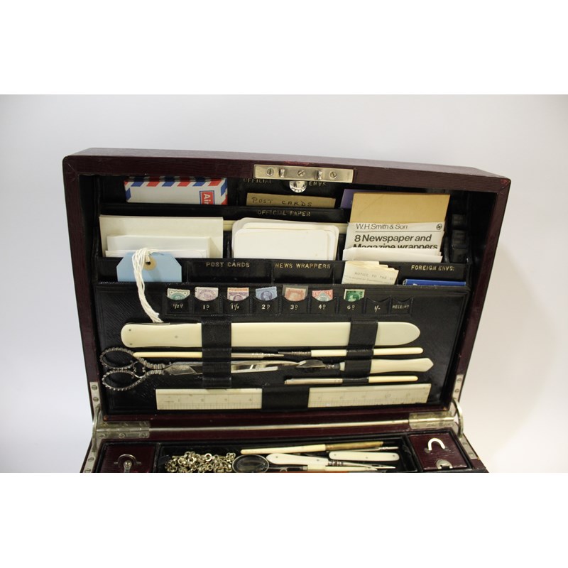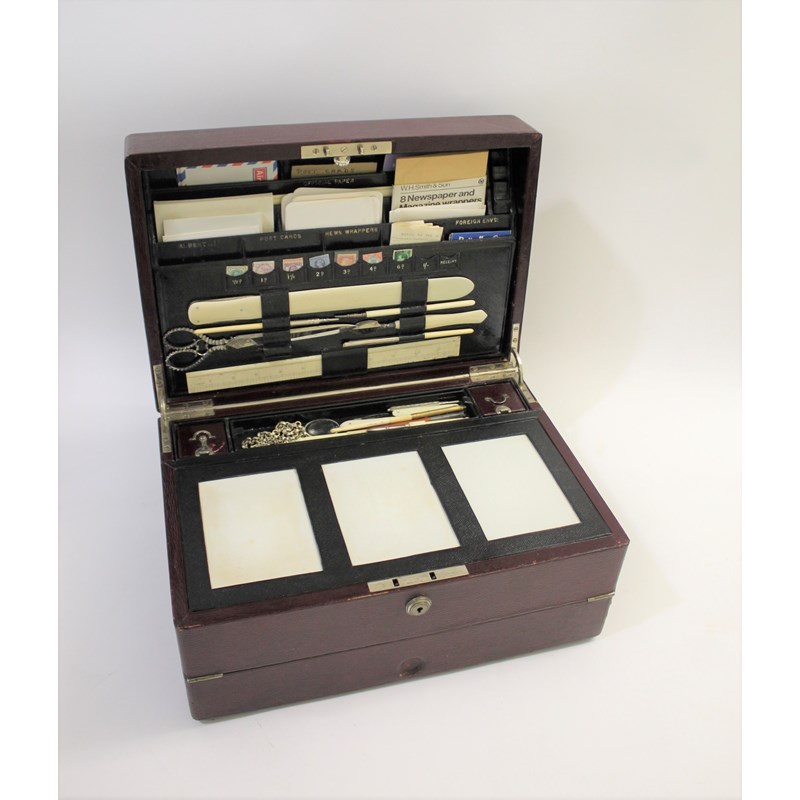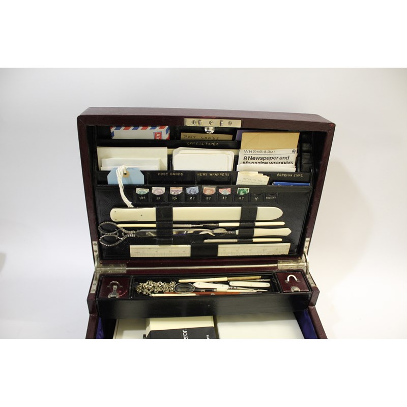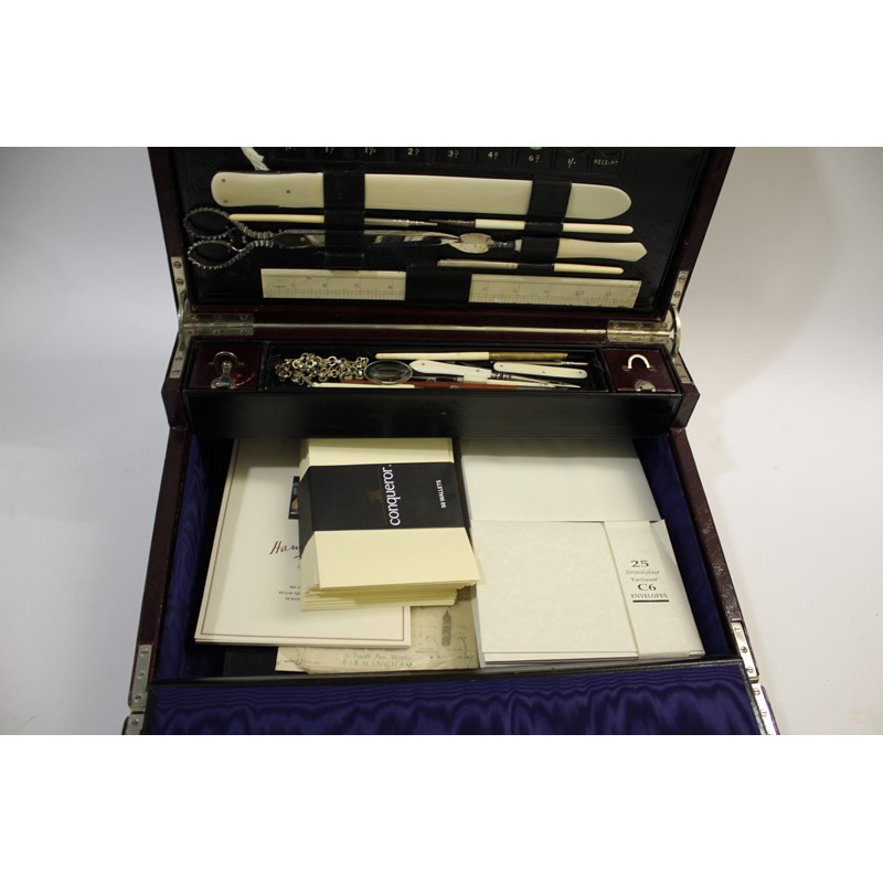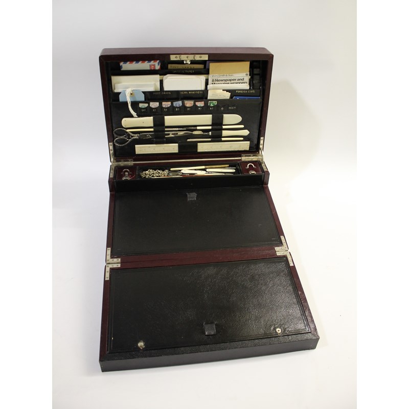 a large maroon leather writing box, with a fold down front writing surface, and compartments for travelling inkwells and writing implements. The inside of the lid with a variety of compartments (Official Envs, Official Paper, Post Cards, Stamps, etc) and also with an ivory ruler, large scissors, ivory paper knife etc. Marked on the lock, Jenner & Knewstub, 33 St James St, London, and with a metal carrying handle. 41cms by 28cms