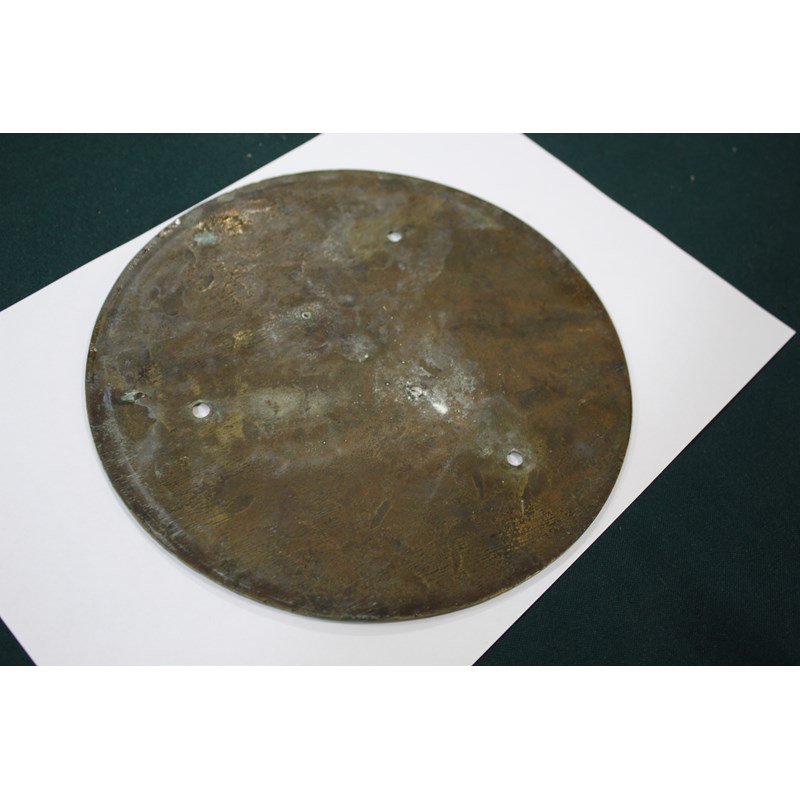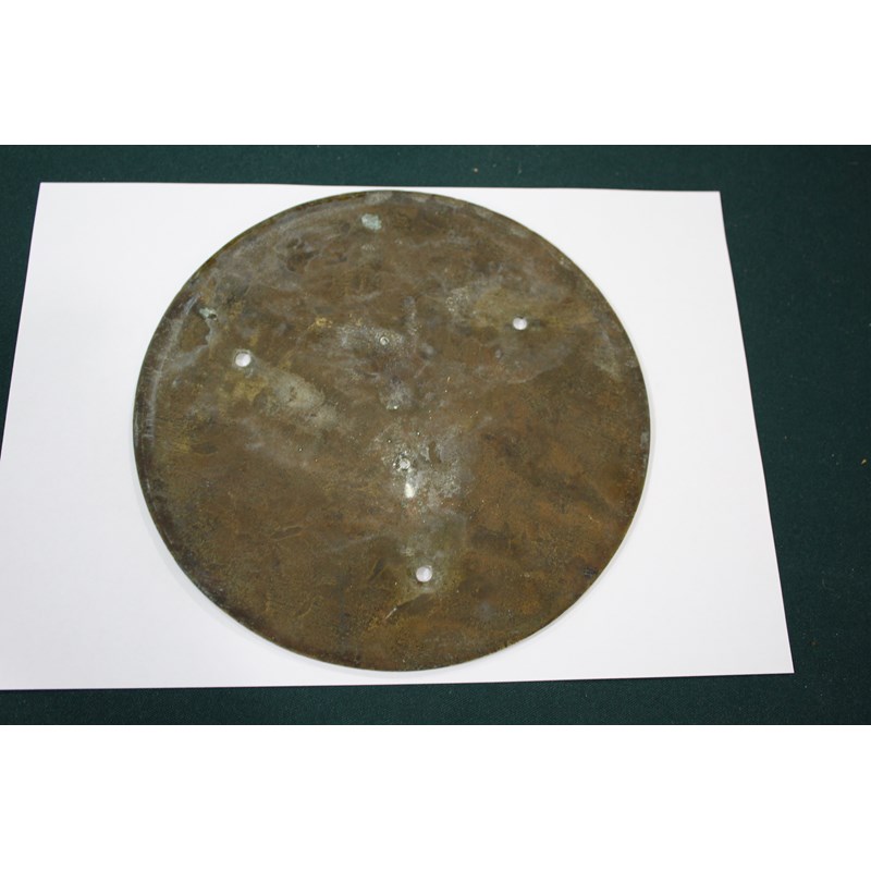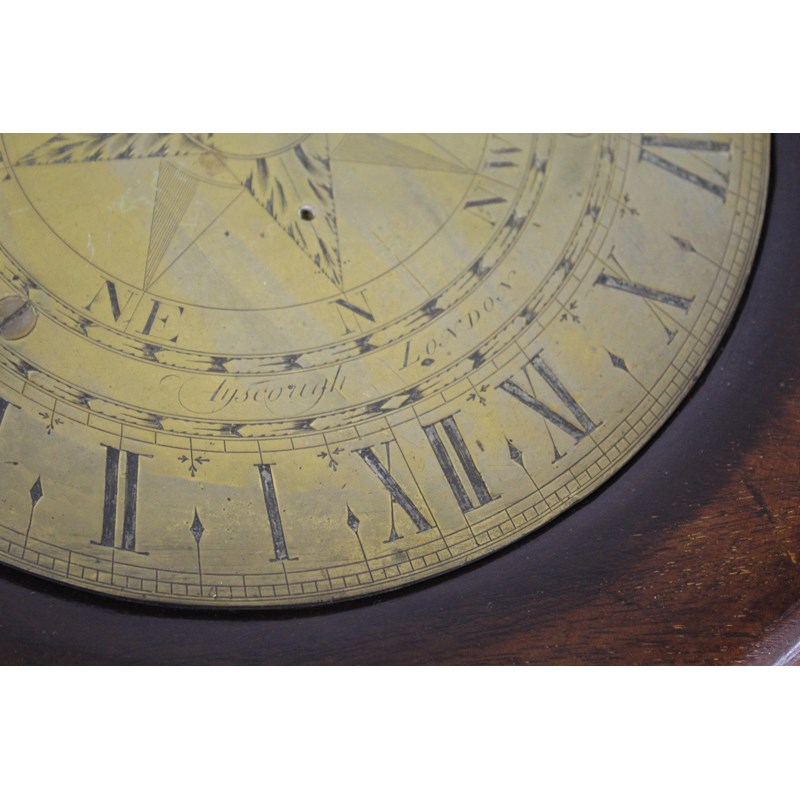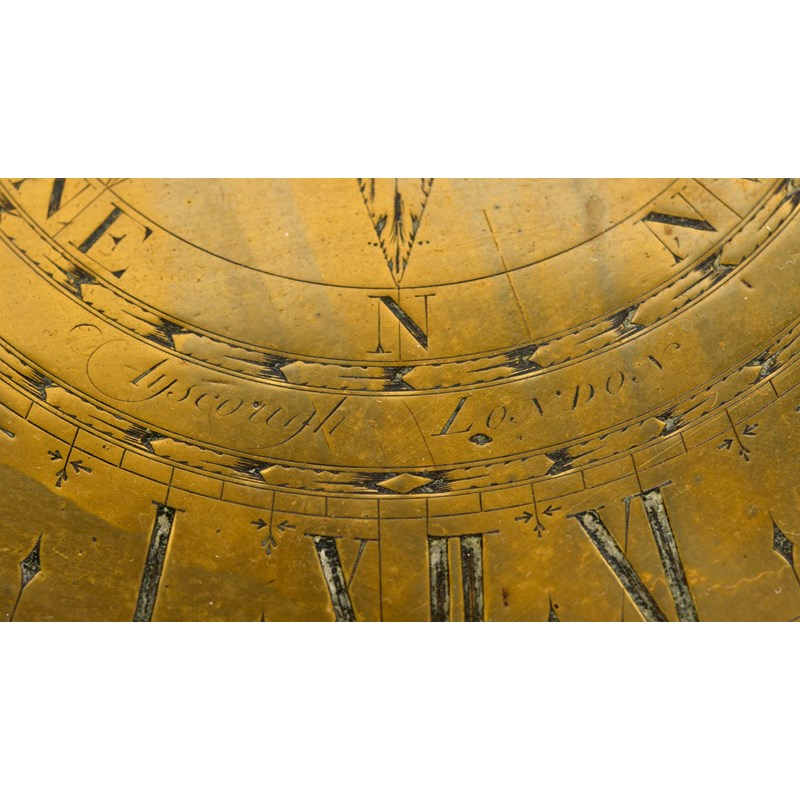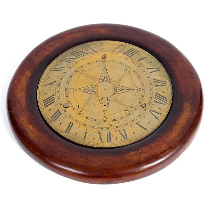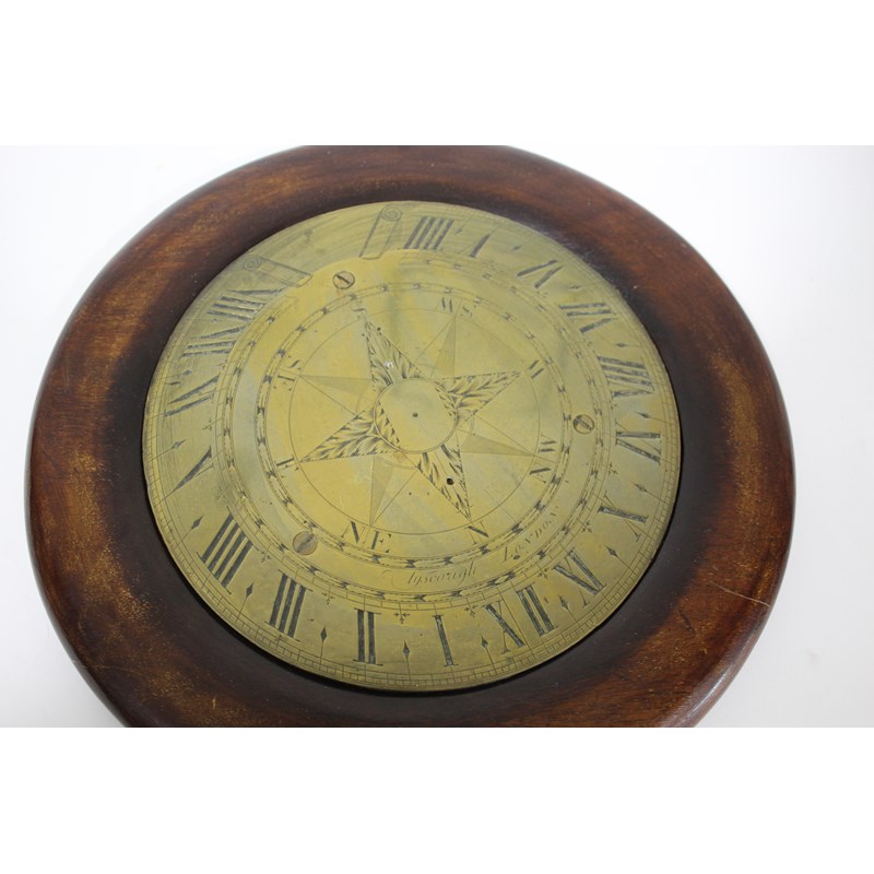 probably mid 18thc, an interesting brass sundial engraved with a sunburst shape in the centre and with roman numerals, marked Ayscough, London. Mounted in a wooden base, missing its gnomen. Dial 20cms diameter