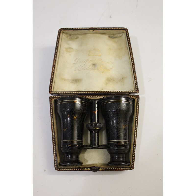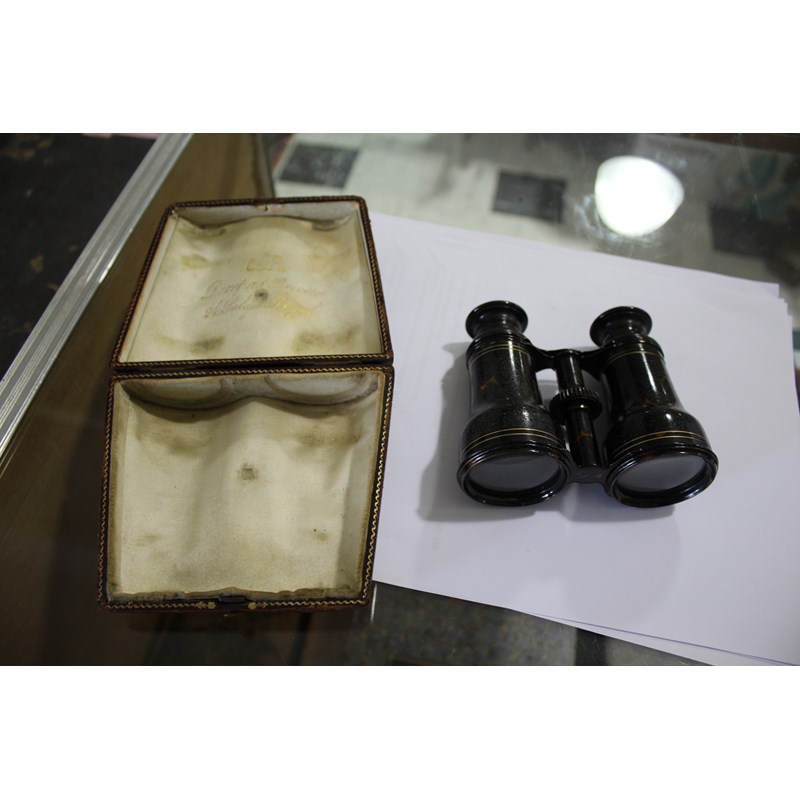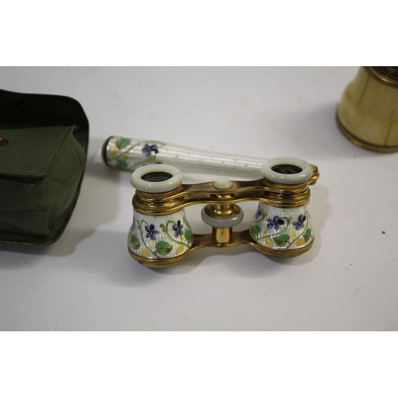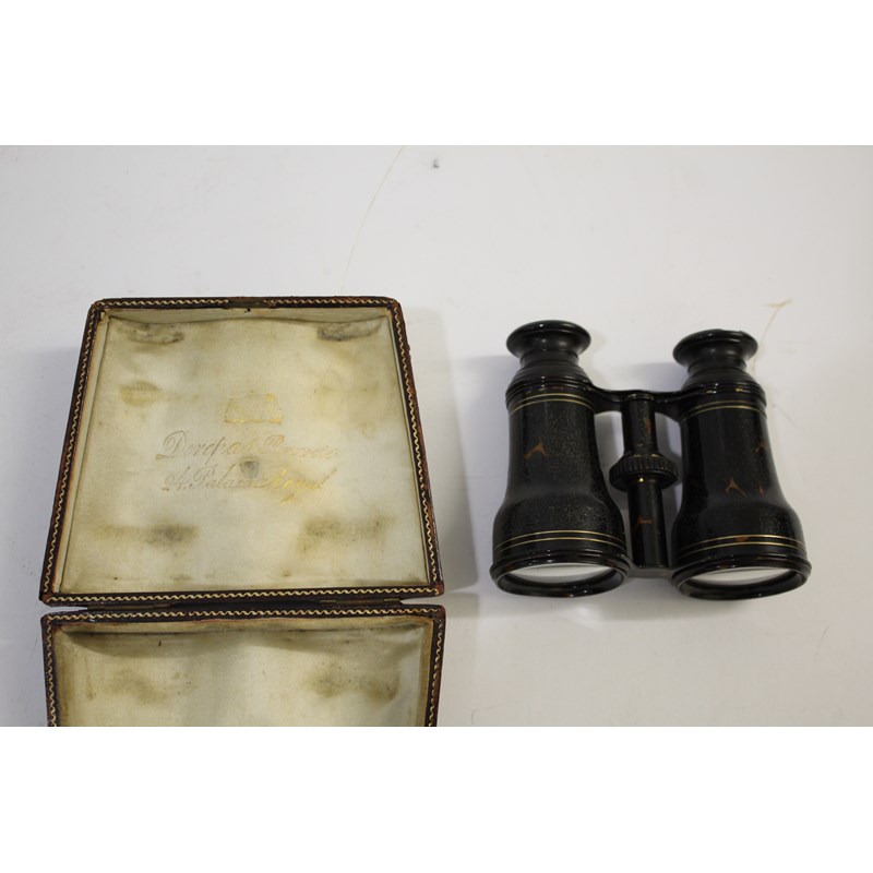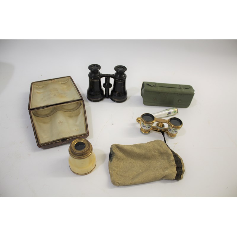 including a 19thc ivory and brass monocular, marked Soleil Optician Du Roi, Passage Feydeau No 21, in a pouch. Also with a wonderful quality pair of enamel, brass and mother of pearl opera glasses in original case (floral design), and a pair of tortoiseshell opera glasses in original leather fitted case, marked for Derepas, 24 Palais Royal, slide rule etc.