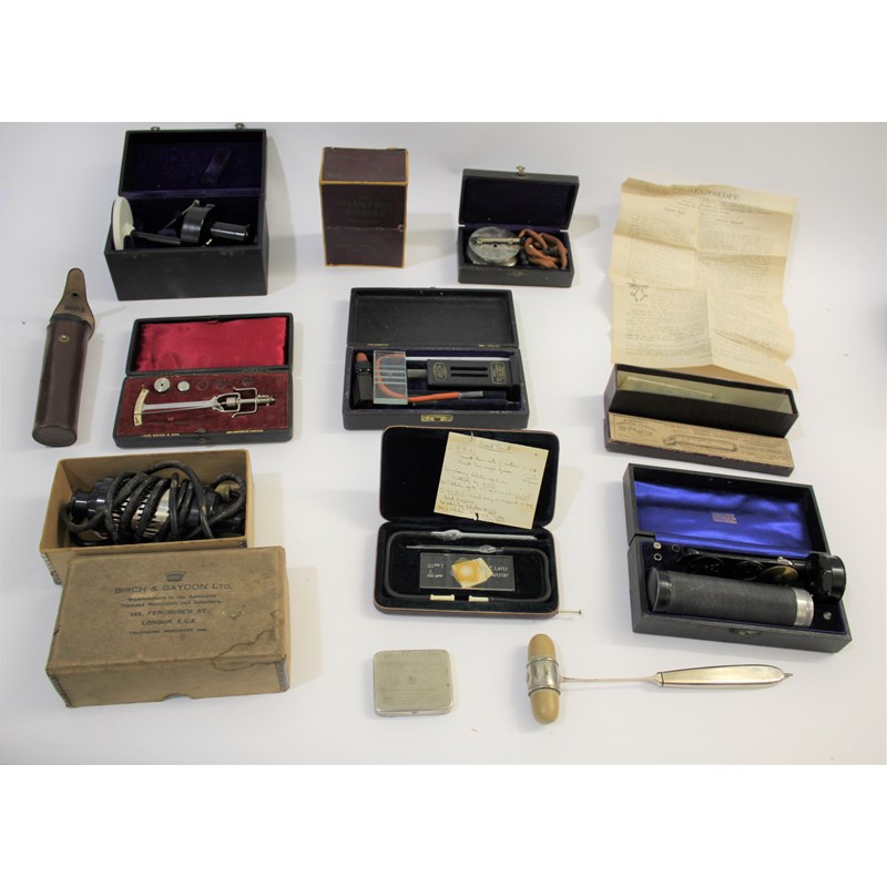 including a cased Leitz Haemacytometer Thoma, a Hawksley Crista Haemoglobinometer, a Dr Bengue's Anaesthetic Chlorethyl, Martin Wallach Phonendoscope, Zeiss Ikon portable microscope, Theodore Hamblin Ophthalmoscope, Tabloid Hypodermic Case, Weiss & Son scales, Parke Davis & Co Nebuliser, Examination Lamp etc. Also with a boxed Parker Vacumatic Fountain Pen with 14k nib.