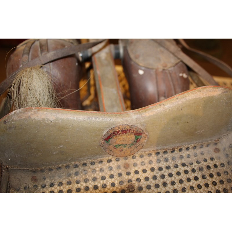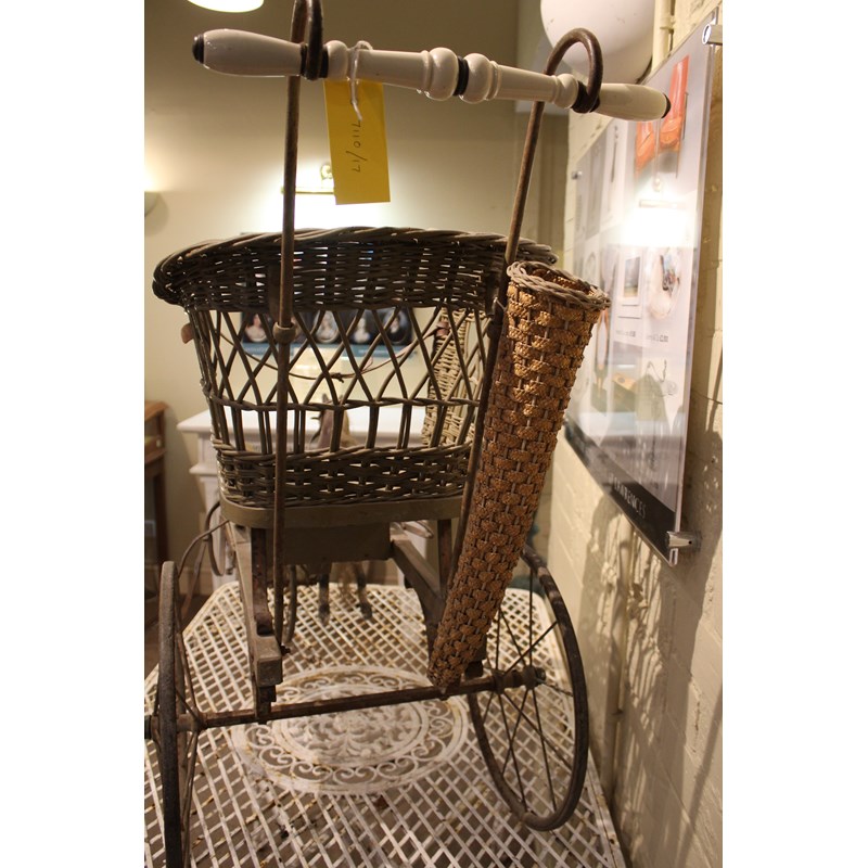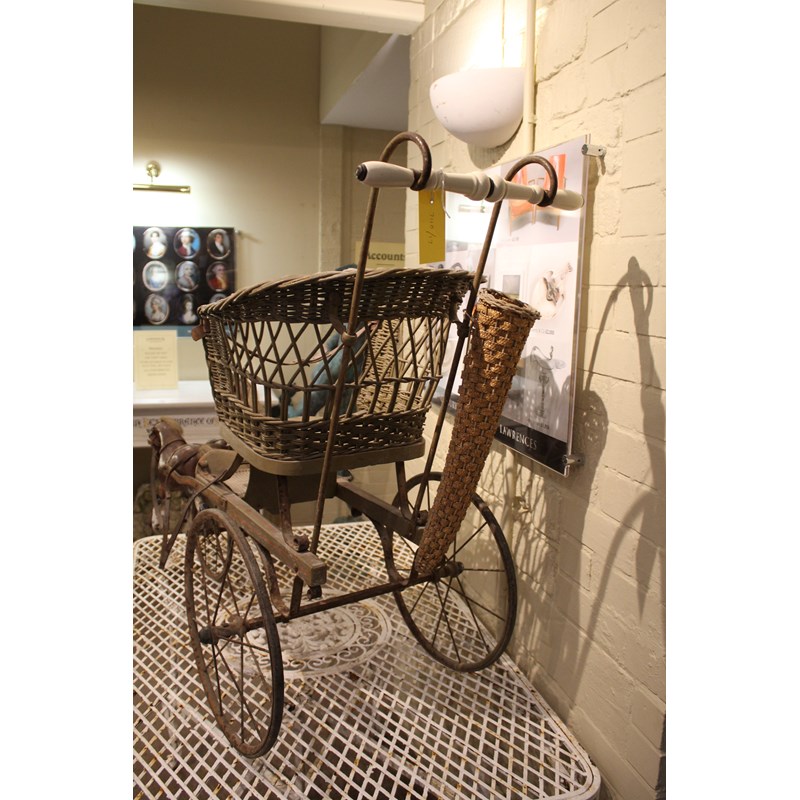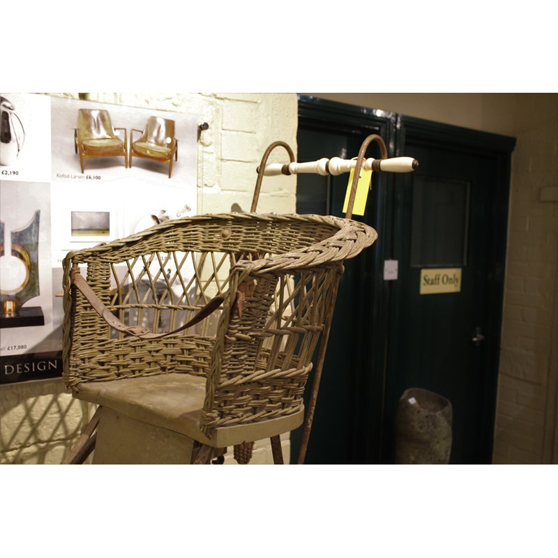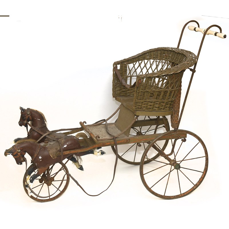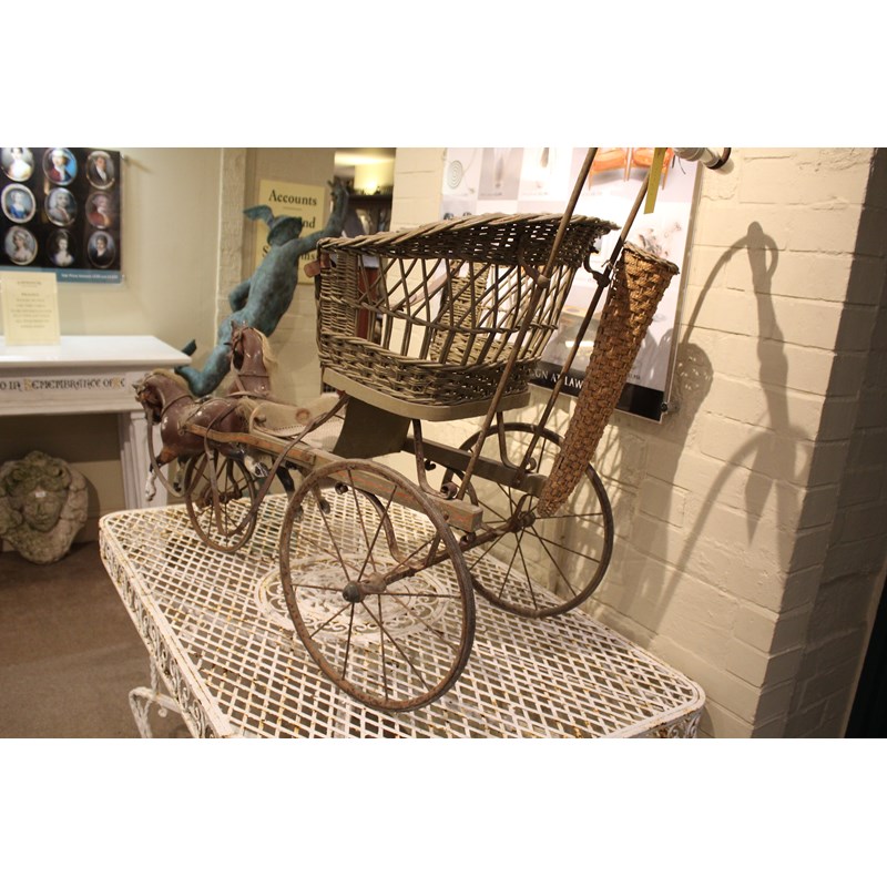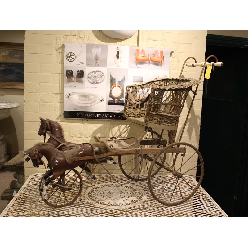 an unusual late Victorian child's carriage, with a painted wooden and metal frame and wicker seat with leather strap to hold a child in. With two painted wooden horses on the front which move up and down as it's pushed along, and with a ceramic handle and wicker umbrella holder on the back. With the remains of a makers label, difficult to read. 99.5cms high, 110cms long from front to back wheel.