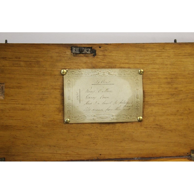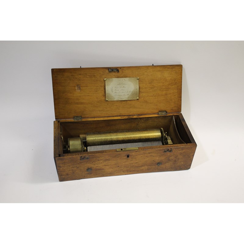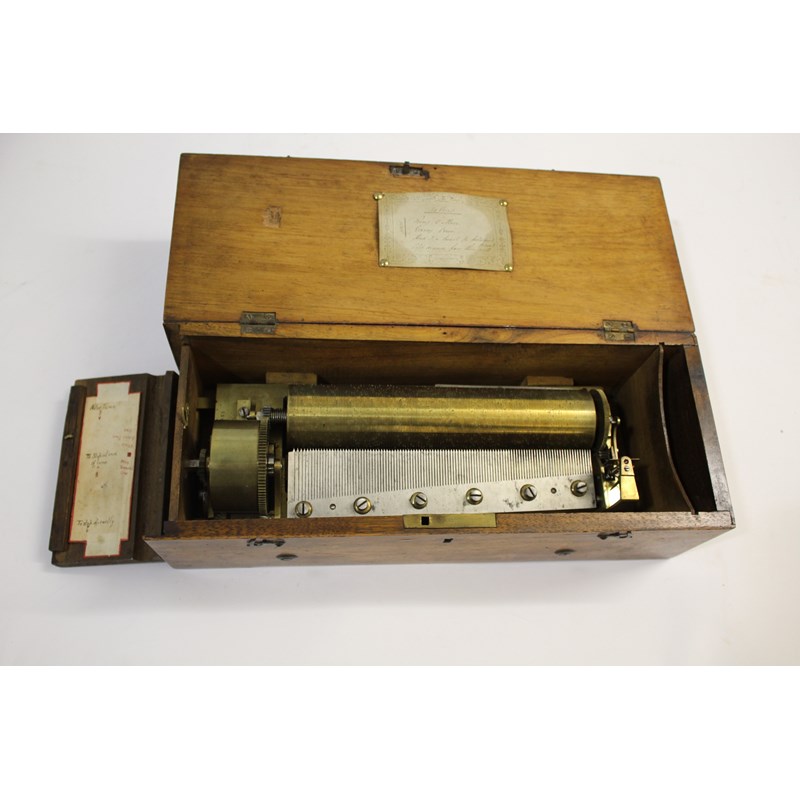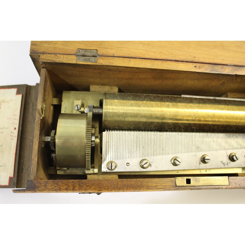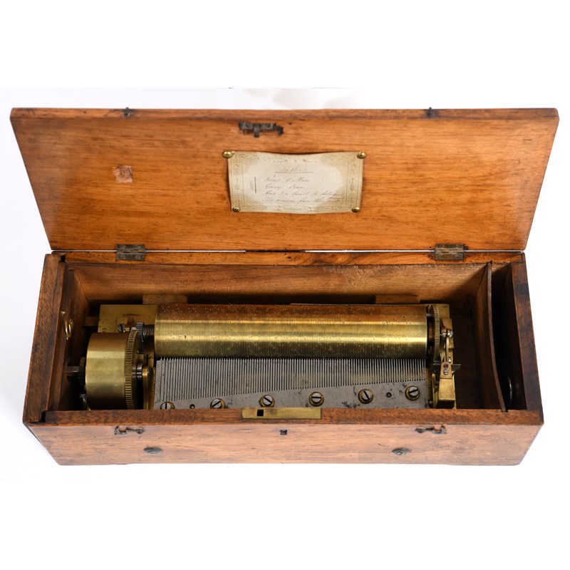 EARLY MUSICAL BOX a early 19thc musical box with a 4 air movement, with a fold down flap to reveal 3 brass levers. With a songsheet on the inside of the lid (numbered 11835 and also stamped on the mechanism with the same number), and in a plain walnut case. In working order and teeth all present, cylinder 20cms long, case 35cms long.