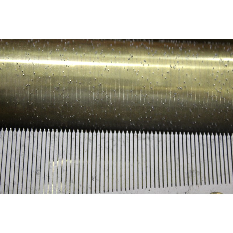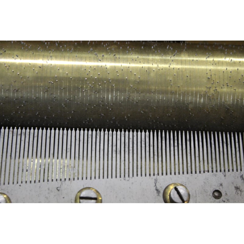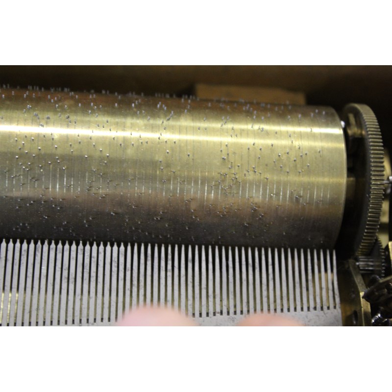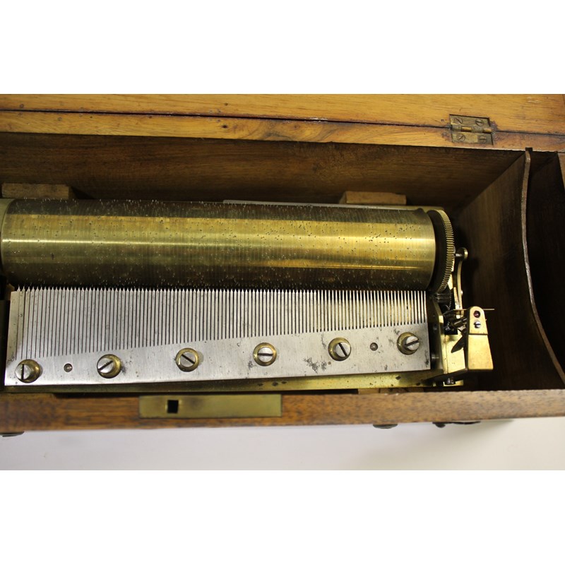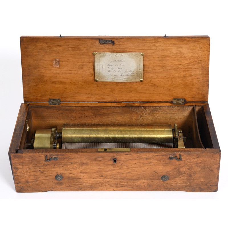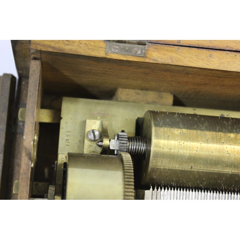 EARLY MUSICAL BOX a early 19thc musical box with a 4 air movement, with a fold down flap to reveal 3 brass levers. With a songsheet on the inside of the lid (numbered 11835 and also stamped on the mechanism with the same number), and in a plain walnut case. In working order and teeth all present, cylinder 20cms long, case 35cms long.