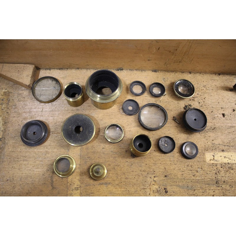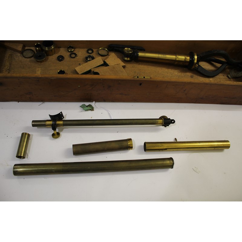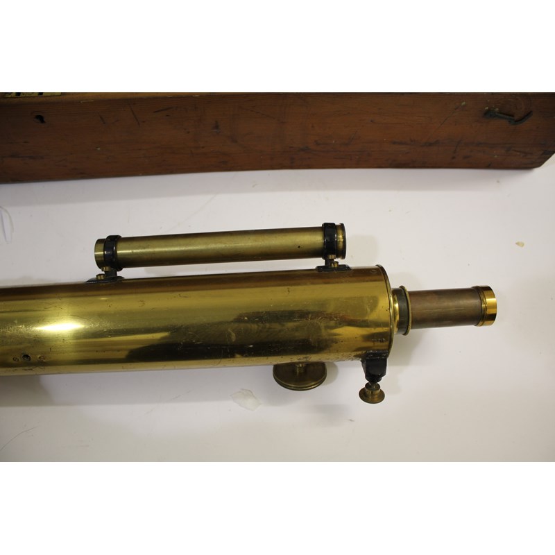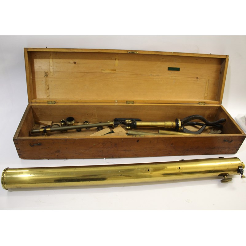 a large brass 3 inch telescope with a draw barrel, subsidiary sight and a range of accessories including various lenses. With a brass and metal folding stand and in a wooden case. Marked, Armstrong & Bro, 88 Deansgate, Manchester. Cylinder 95cms long