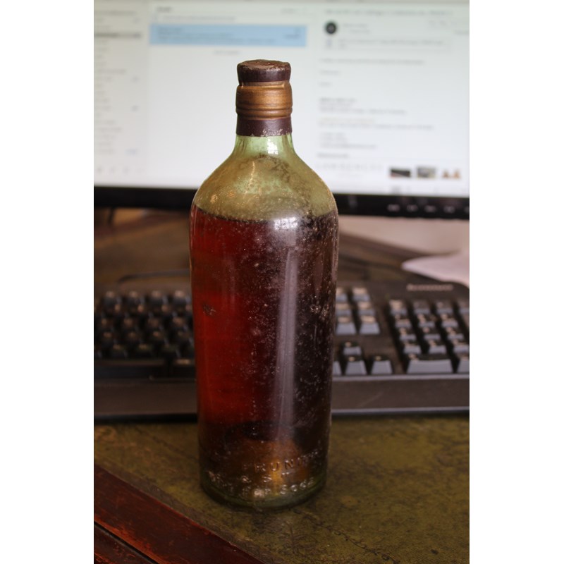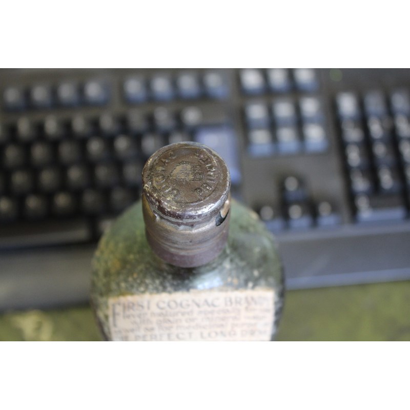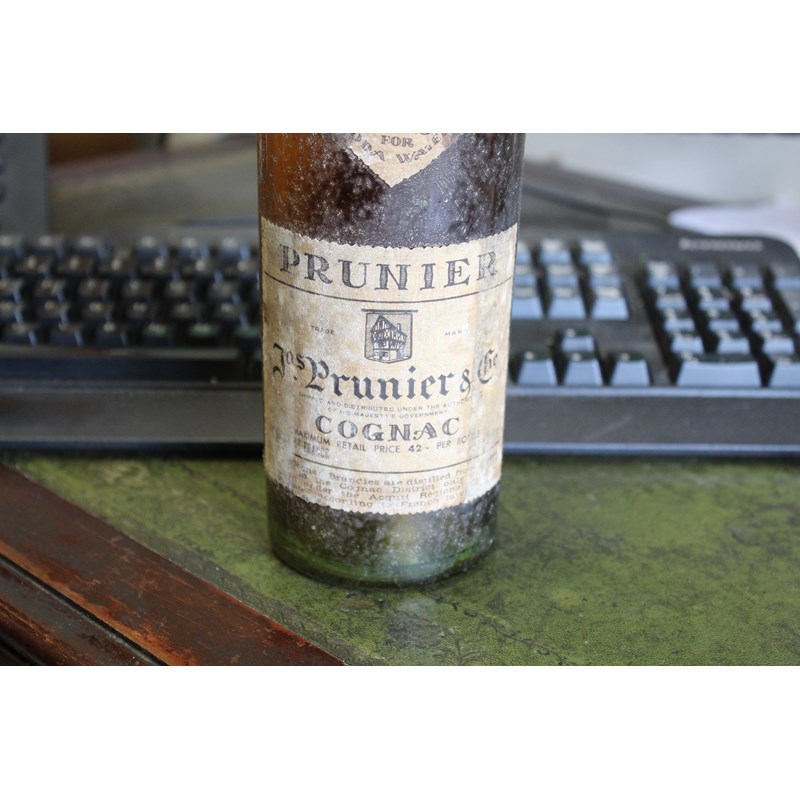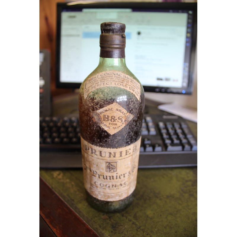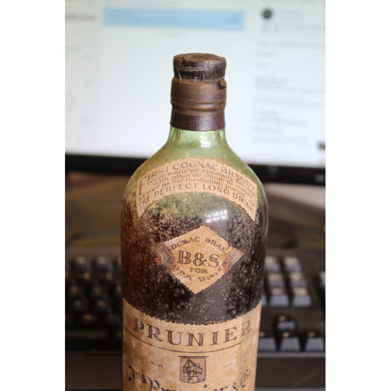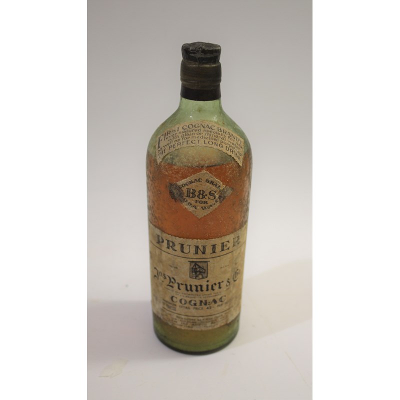 Prunier & Cie, Cognac Brandy for Soda Water, perhaps 1930s or 1930's, 70 degrees proof, 'First Cognac Brandy ever matured specially for use with plain or mineral water as well as for medicinal purposes', probably 70cl, level low shoulder, cork and foil good, label worn and yellowed, one bottle