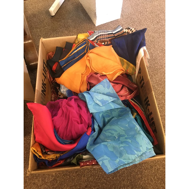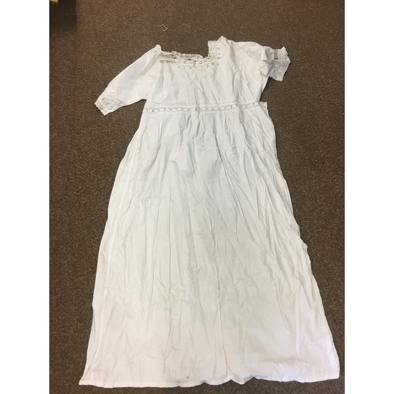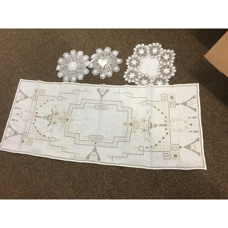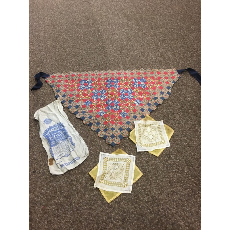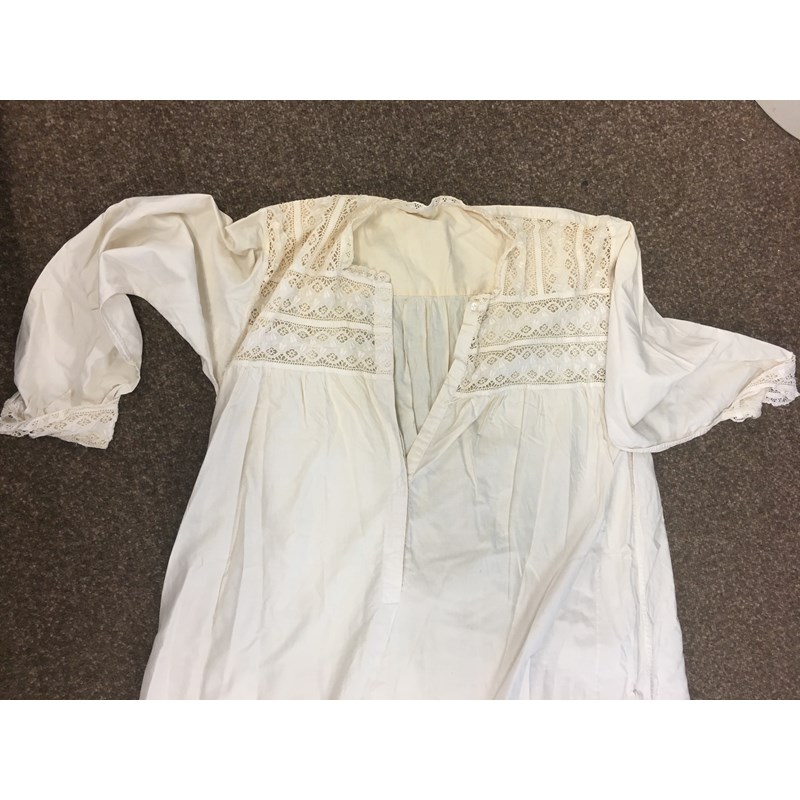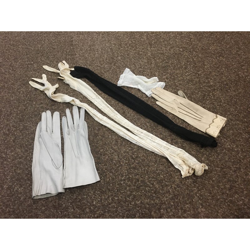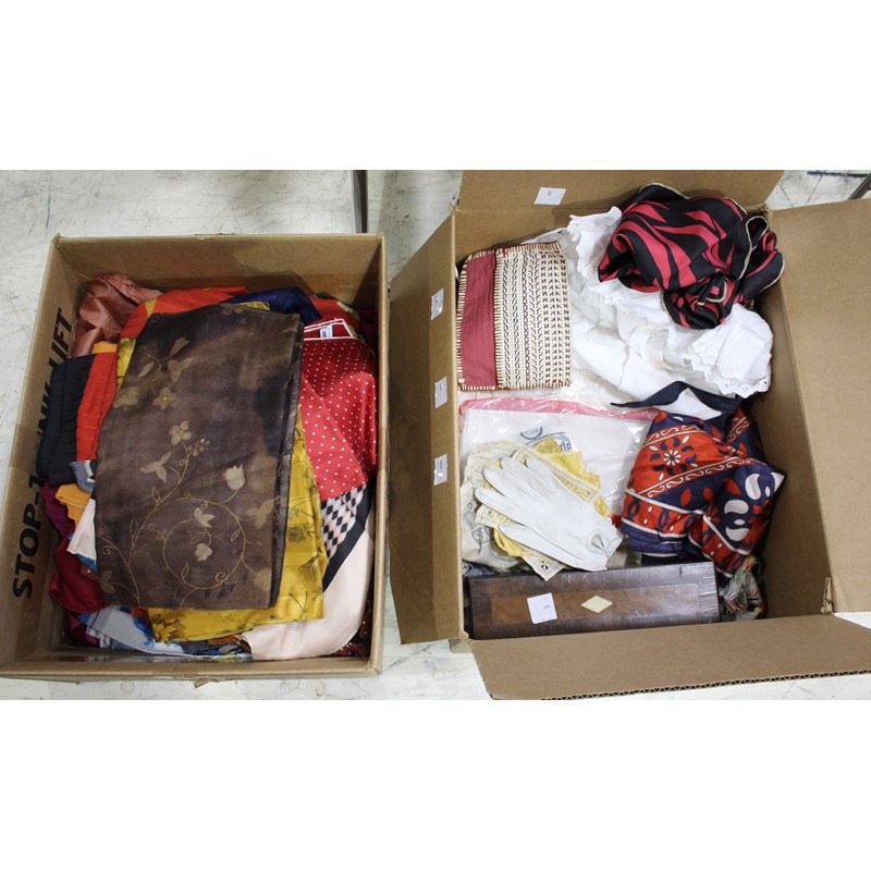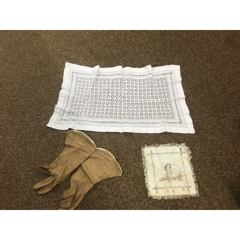 including a 1930's 'Ritchwear' white sleeveless tennis/sun dress, 2 cotton nightdresses, a collection of white embroidered table linens, hand painted silk mats edged with lace, a silk lined box containing gloves and glove stretchers, and a qty of vintage textiles and scarves.