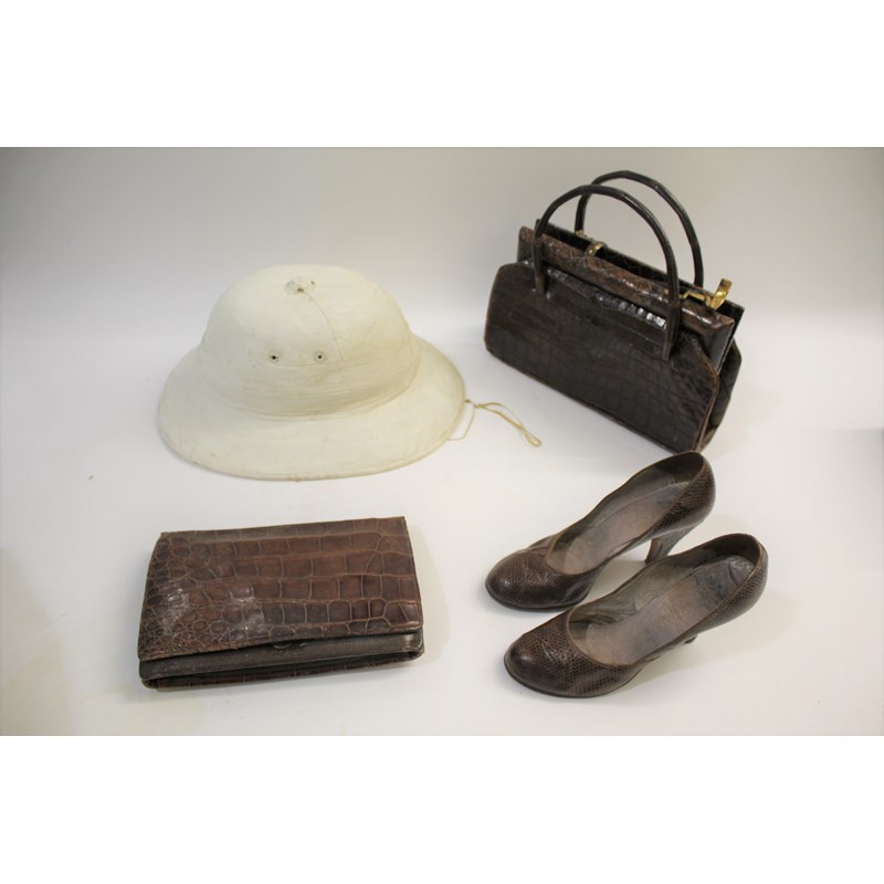 a vintage bag with brass clasps and compartments inside, also containing a crocodile skin wallet. Also with a vintage crocodile skin clutch bag, a pair of vintage size 5 shoes (possibly crocodile) made Expressly for Charles of Bath, and a vintage Pith helmet.