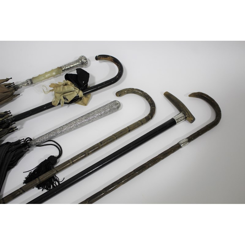 including a parasol with an Indian or Burmese handle with floral design (makers name inside difficult to read), a parasol with silver mounted handle and collar, another vintage parasol, a walking cane with horn handle and silver collar, and 2 other walking canes. (6)