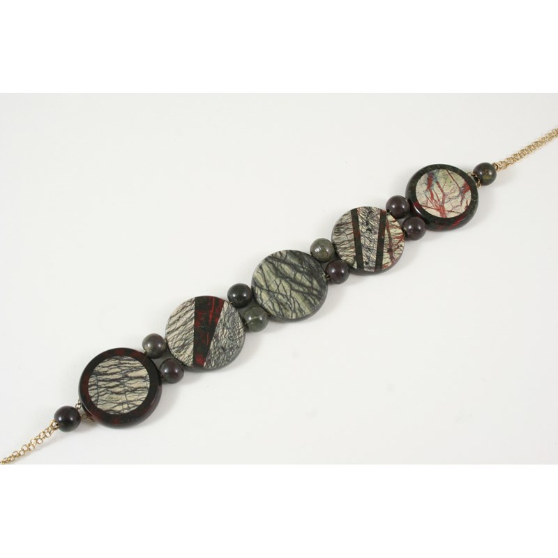 A SCOTTISH HARDSTONE NECKLACE formed with four circular sections of agate, on a gold chain, 43cm. long.