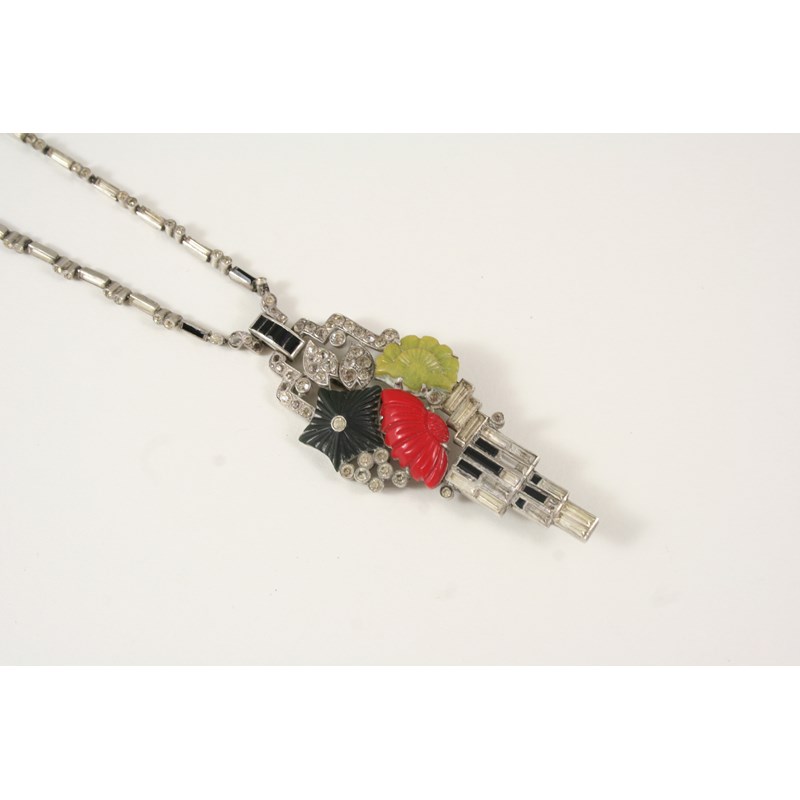 AN ART DECO SILVER AND PASTE SET PENDANT of scolling foliate design, the pendant 7.5cm. long.