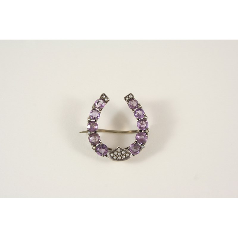 AN AMETHYST AND PEARL HORSESHOE BROOCH set with circular-cut amethysts and small half pearls, in silver, 3cm. wide.