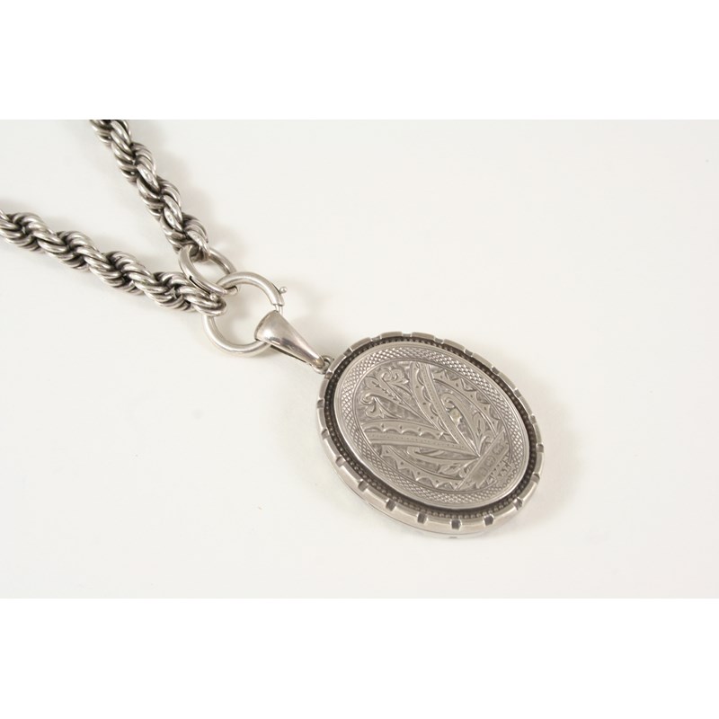 A VICTORIAN SILVER LOCKET AND CHAIN the oval-shaped locket with engraved foliate decoration to both sides, 4 x 3.2cm., on a silver rope link chain, total weight 38.3 grams.