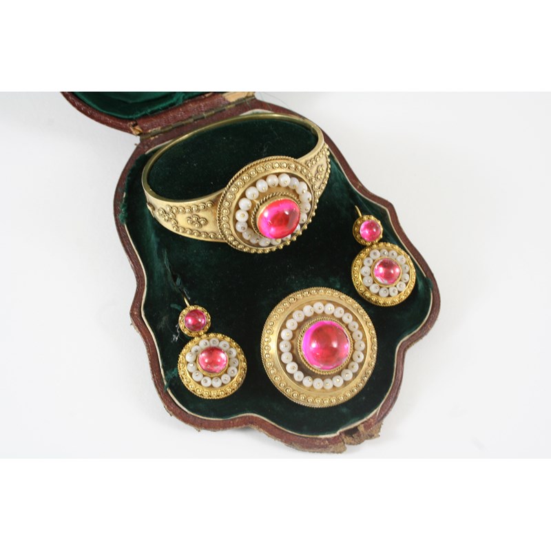 comprising a bangle, brooch and a pair of drop earrings, all with embossed gold decoration and set with pink paste stones.
