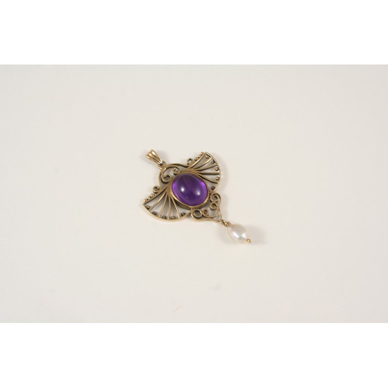 AN AMETHYST AND GOLD PENDANT the 9ct. gold openwork design is centred with an oval cabochon amethyst and suspends a pearl drop, 3cm. wide.