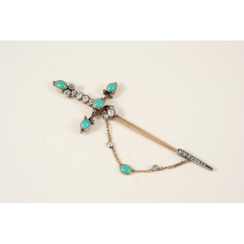 A VICTORIAN DIAMOND AND TURQUOISE DAGGER BROOCH set with turquoise cabochons and old brilliant-cut and rose-cut diamonds in silver and gold, 9cm. long.