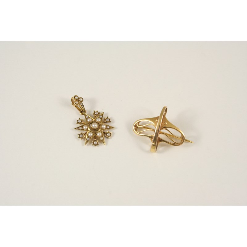 the starburst design set overall with graduated half pearls, stamped with maker's mark to the reverse, 2cm. wide, together with a 9ct. gold brooch by Murrle Bennett & Co., of openwork geometric design, with maker's mark to the reverse, 3cm. wide.