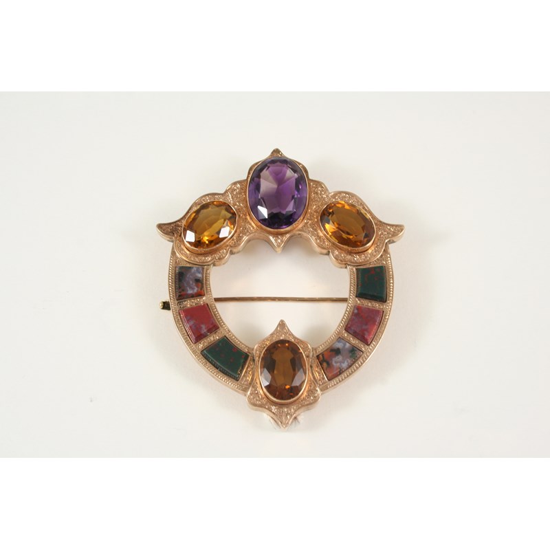 A SCOTTISH AGATE AND GEM SET BROOCH the foliate engraved gold mount is set with an oval-shaped amethyst, three oval-shaped citrines and assorted sections of agate, 6cm. wide.