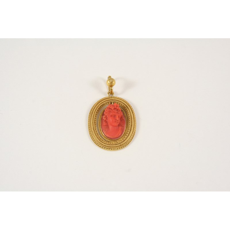 the carved coral cameo depicting the head of a bacchante-nymph is suspended within a rope and ball wirework frame, 2.8cm. wide.