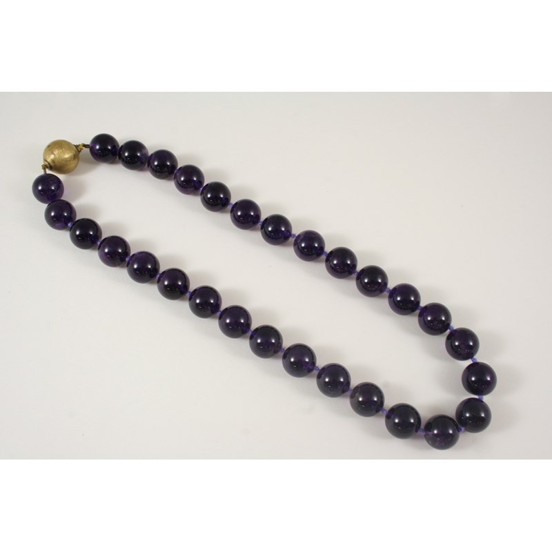A SINGLE ROW UNIFORM AMETHYST BEAD NECKLACE formed with twenty nine amethyst beads to a 9ct. gold ball clasp, 47cm. long.