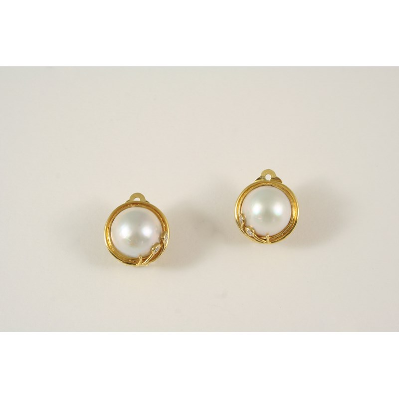 A PAIR OF MABE PEARL, DIAMOND AND GOLD EARCLIPS each set with a mabe pearl within an 18ct. gold mount set with two small diamonds, 2.2cm. dia.