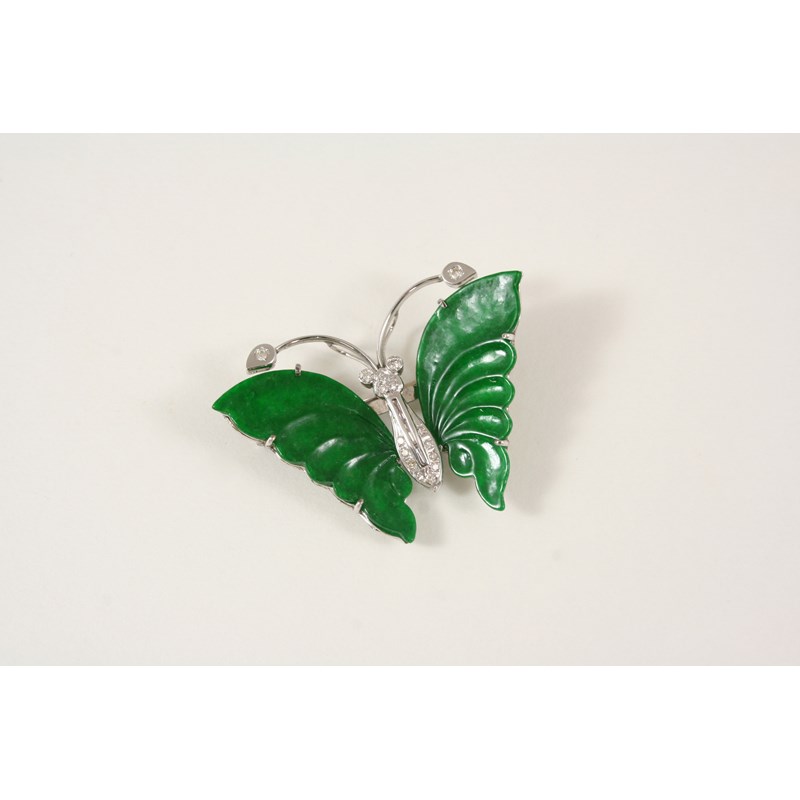 A JADE AND DIAMOND BUTTERFLY BROOCH the wings formed with sections of jade, the body set with circular-cut diamonds, 5cm. wide.