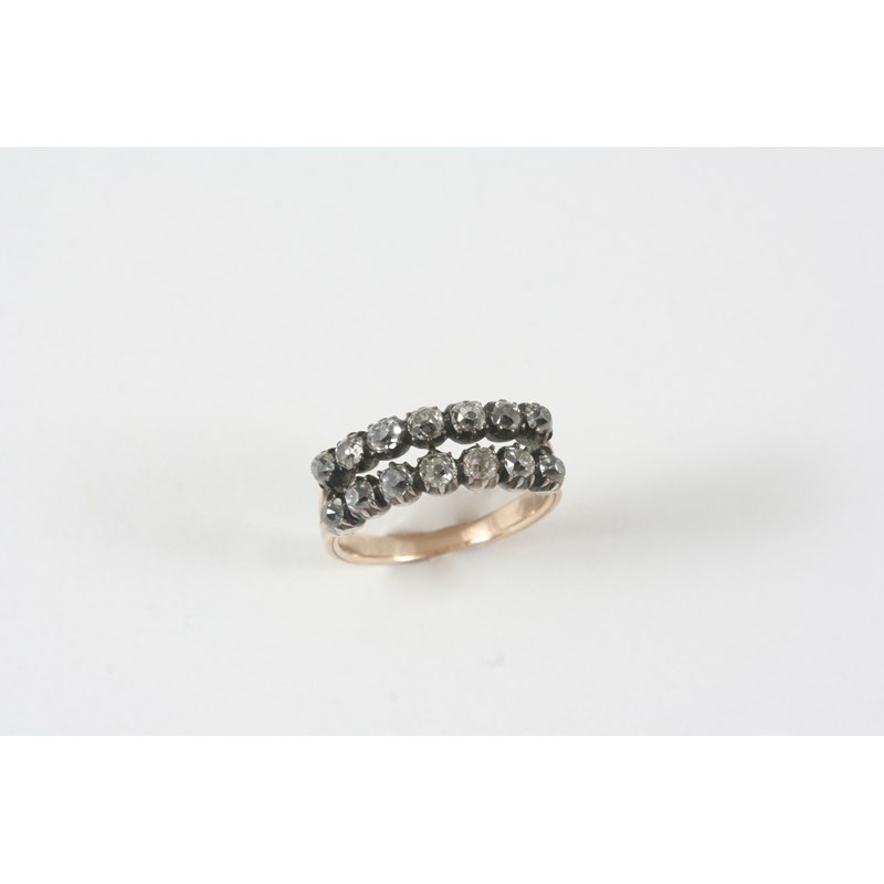 A GEORGIAN TWO ROW RING set with rose-cut diamonds in silver and gold. Size J.