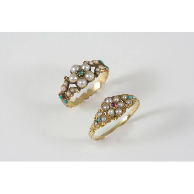 the flowerhead design is set with half pearls and turquoise cabochons, in gold, size I 1/2, together with another Victorian pearl, gem set and gold foliate cluster ring, size T 1/2.