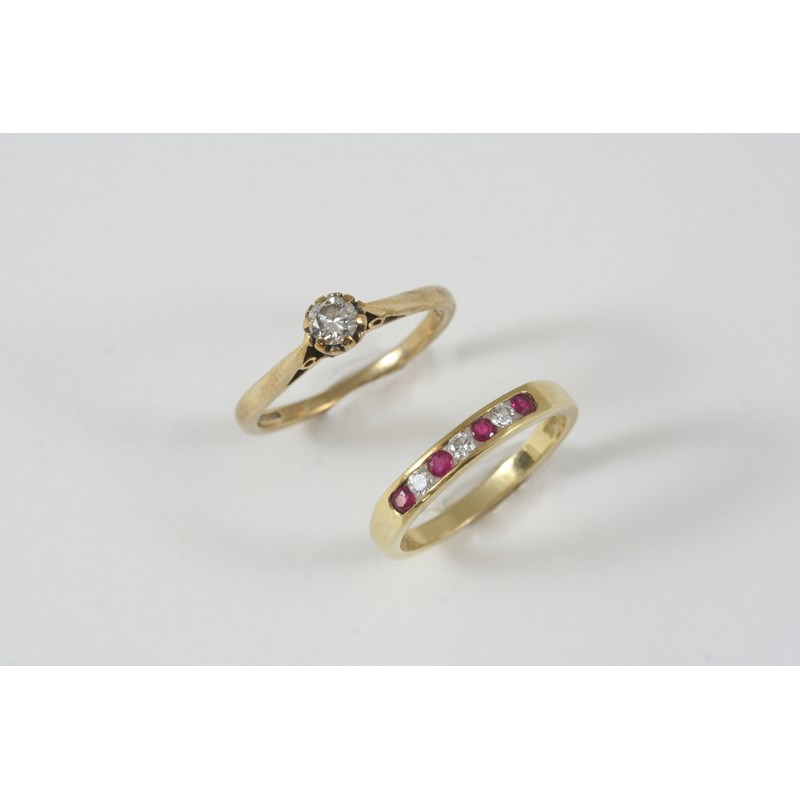 A RUBY AND DIAMOND HALF HOOP RING set alternately with circular-cut rubies and diamonds in 18ct. gold, size N 1/2, together with a diamond solitaire ring, set with a circular-cut diamond in gold, size O 1/2.