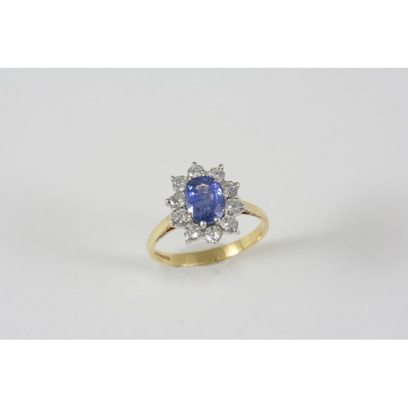 A SAPPHIRE AND DIAMOND CLUSTER RING the oval-shaped sapphire is set within a surround of ten circular-cut diamonds, in 18ct. gold. Size Q.