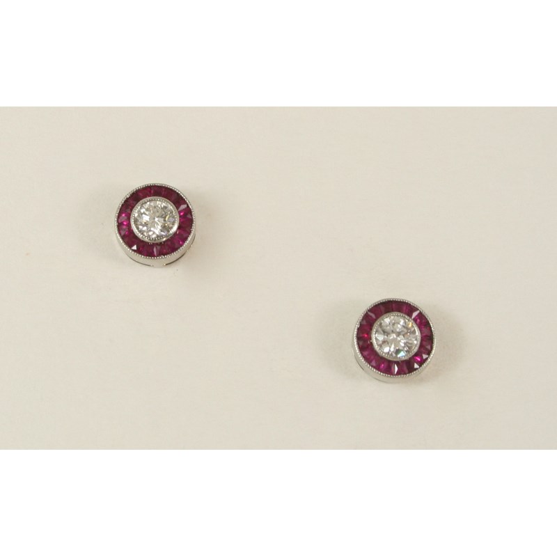 A PAIR OF RUBY AND DIAMOND CLUSTER STUD EARRINGS each earring centred with a circular-cut diamond within a surround of calibre-cut rubies.