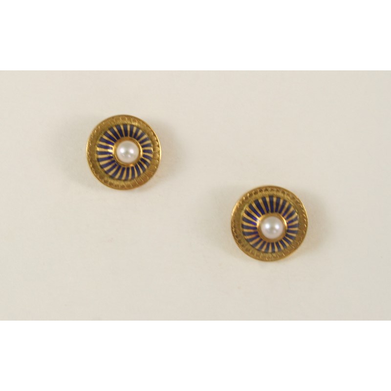 A PAIR OF GOLD, BLUE ENAMEL AND PEARL STUD EARRINGS each gold dome with blue enamel decoration and centred with a small pearl.