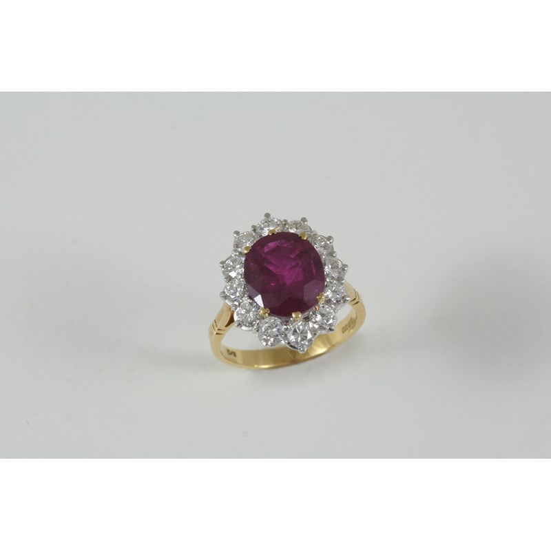 A RUBY AND DIAMOND CLUSTER RING the oval-shaped ruby is set within a surround of twelve brilliant-cut diamonds, in 18ct. gold. Size M.