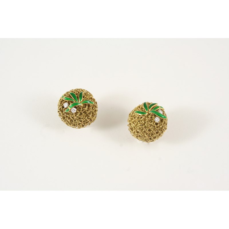 A PAIR OF GOLD, DIAMOND AND ENAMEL PINEAPPLE CLIP EARRINGS each set with two circular-cut diamonds and with green enamel leaf decoration, 2.5cm. dia.