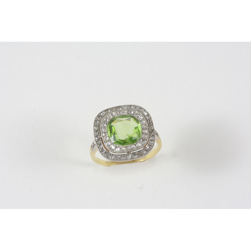 AN EDWARDIAN PERIDOT AND DIAMOND CLUSTER RING the cushion-shaped peridot is set within a double surround of rose-cut diamonds, in gold. Size M 1/2.
