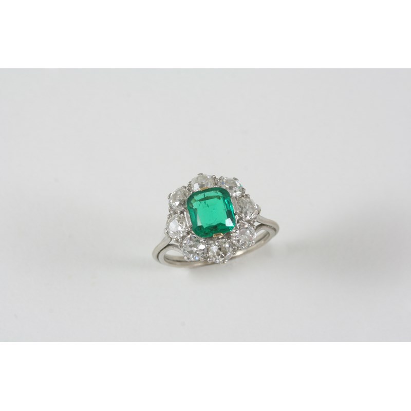 AN EMERALD AND DIAMOND CLUSTER RING the cushion-shaped emerald is set with eight old brilliant-cut diamonds. Size N 1/2.