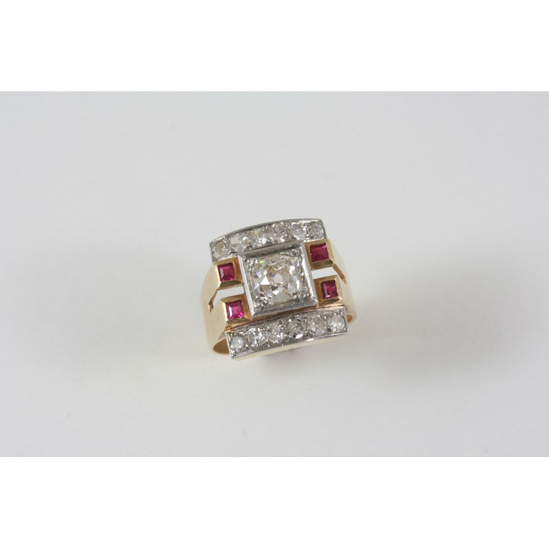 the central old brilliant-cut diamond is set with two square-shaped rubies to each shoulder, within a border of further old brilliant-cut diamonds, in gold. Size L.