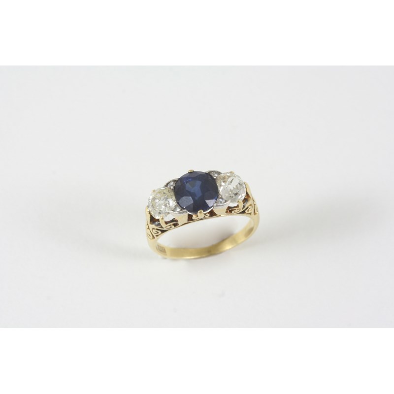 the oval-shaped sapphire is set with two cushion-shaped diamonds, with rose-cut diamond highlights in 18ct. gold. Size M.