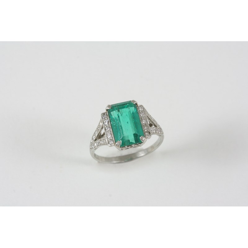AN ART DECO EMERALD AND DIAMOND RING the emerald-cut emerald is set with single-cut diamonds to the bifurcated shoulders, in platinum. Size P.