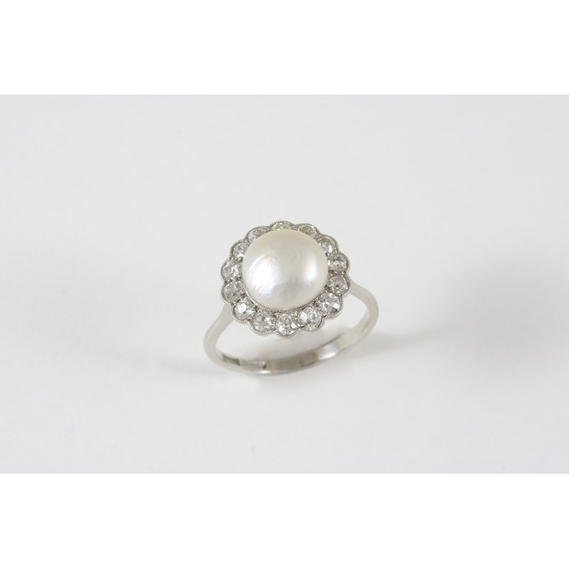the button-shaped pearl is set within a surround of old brilliant-cut diamonds, in platinum. Size P 1/2.