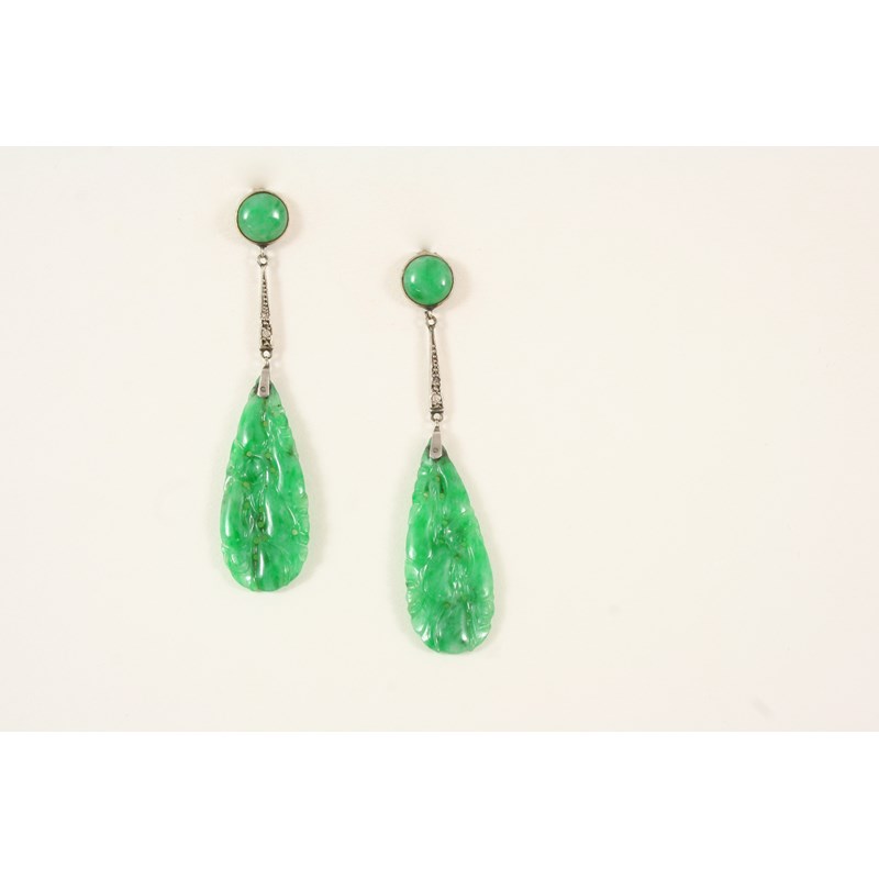 A PAIR OF JADE AND DIAMOND DROP EARRINGS