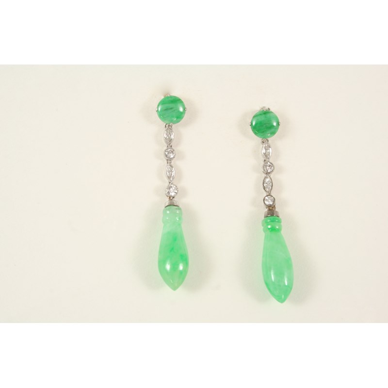 A PAIR OF JADE AND DIAMOND DROP EARRINGS each formed with a row of alternate marquise-cut and circular-cut diamonds suspending a jade drop, with circular jade surmount, 5.5cm. long.