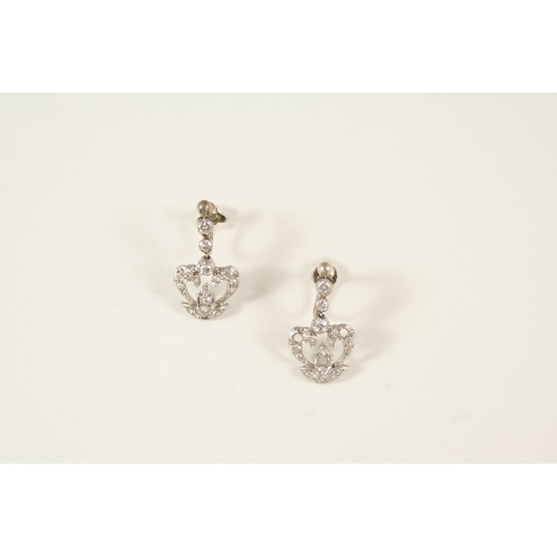 A PAIR OF DIAMOND DROP EARRINGS of openwork, foliate scrolling design, set with circular-cut diamonds (three missing on one earring), 2.5cm. long, with screw fittings.