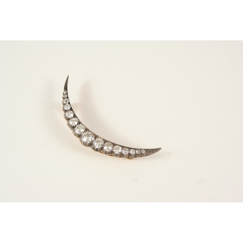 A VICTORIAN DIAMOND OPEN CRESCENT BROOCH formed with graduated old brilliant-cut diamonds in silver and backed in gold, 6cm. wide. In fitted box by Hall & Co., Manchester.