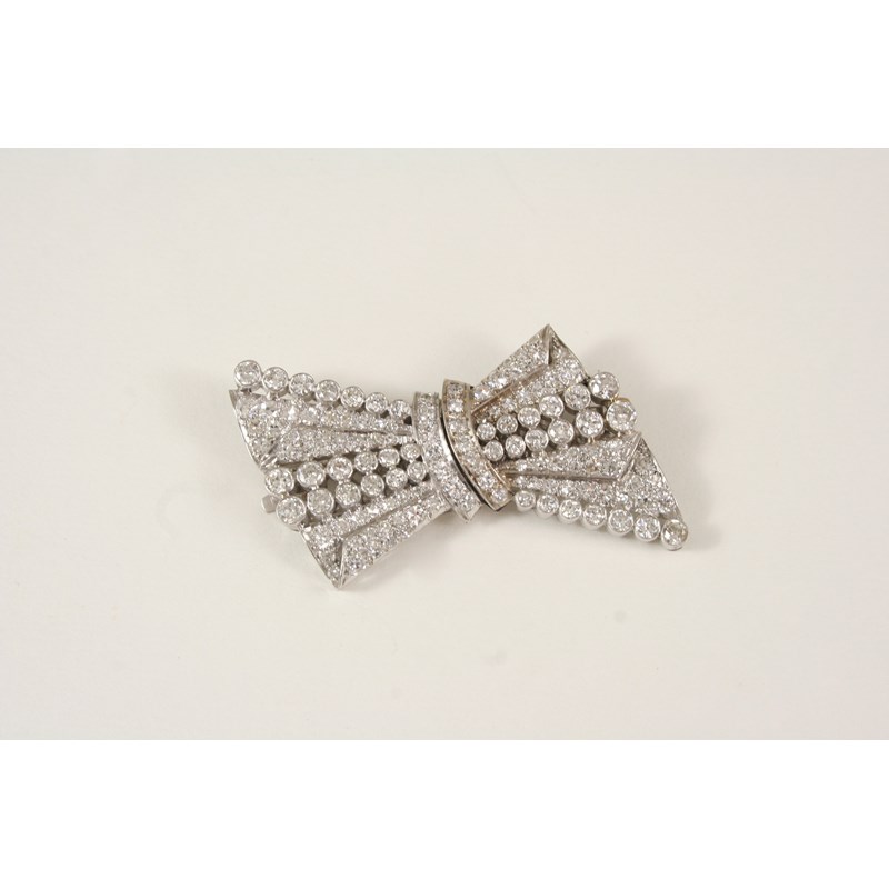 AN ART DECO DIAMOND DOUBLE CLIP BROOCH the stylised bow design set overall with graduated circular diamonds, 5cm. wide.