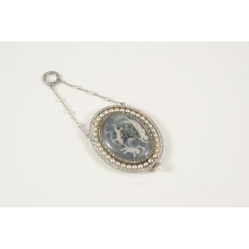 the oval-shaped dial with Arabic numerals and painted with cherubs and a dancing figure, a classical scene to the reverse, within a surround of rose-cut diamonds and untested pearls, on a fine link chain with diamond set circular bale, 8cm. long.