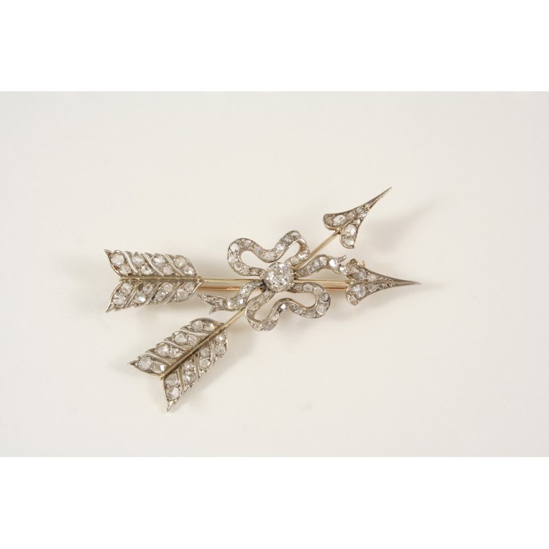 A VICTORIAN DIAMOND SET DOUBLE ARROW BROOCH formed as two crossing over arrows tied with ribbon, centred with an old brilliant-cut diamond and set overall with rose-cut diamonds, in silver and backed in gold, 6.5cm. long.