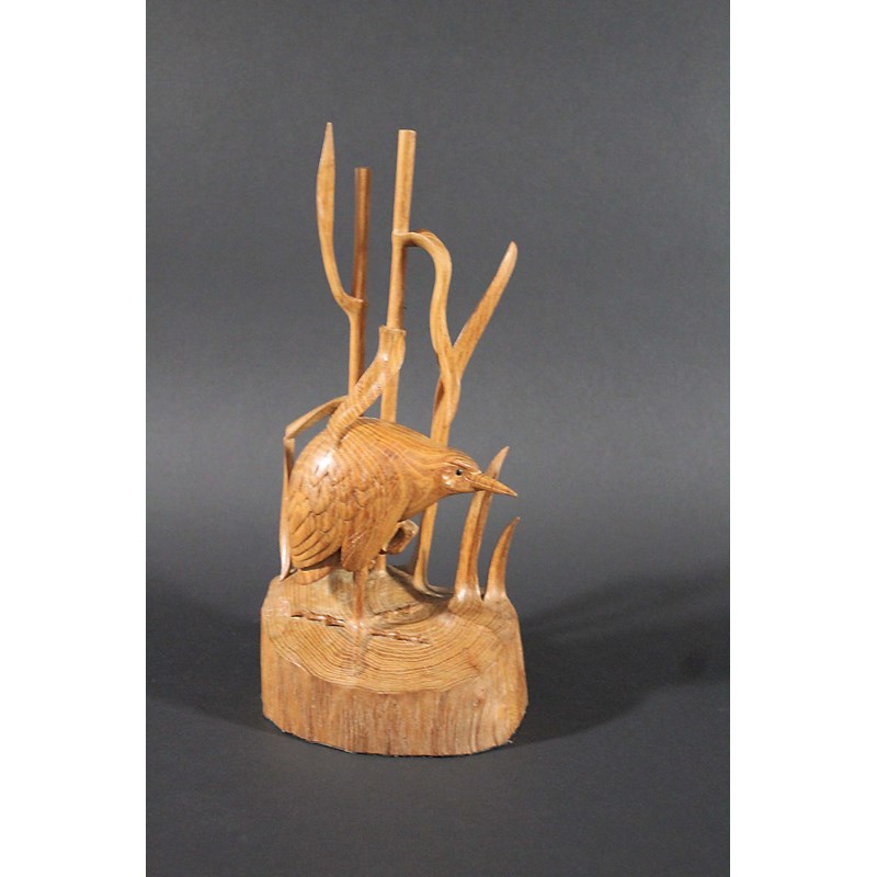 a carved wooden sculpture of a Wading Bird amongst some reeds, probably a Bittern. Possibly carved in Mulberry wood. Carved signature JF. 11 3/4ins (30cms) high