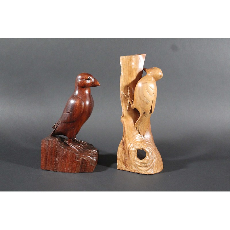 including a carved figure of a Puffin, probably carved in mahogany. Also with a carved figure of a Woodpecker on a tree trunk, possibly in Cherry Wood. Both with carved signature JF. Puffin 9 1/4ins (23.5cms) high, Woodpecker 11ins (28cms) high. (2)