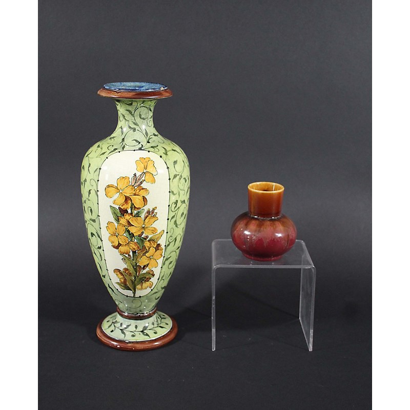 a small Linthorpe vase with a ruby and yellow running glaze. Also with a Doulton Faience vase dated 1879, makers initials for Matilda S Adams. Linthorpe marked, Linthorpe, 811, CH Dresser, and HT monogram (Henry Tooth). 3ins (8cms) high, Doulton 11ins (28cms) high. (2)